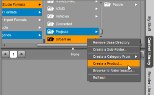Find a folder containing some of the product's assets in the Content Library pane, e.g. in the Poser Formats folder, open the context menu and click “Create a Product…”. A small dialog will pop open, prompting you for a name, and after confirming it with “OK” a new product container will be created in the correct alphabetical sub-folder of the top-level “Products” container.