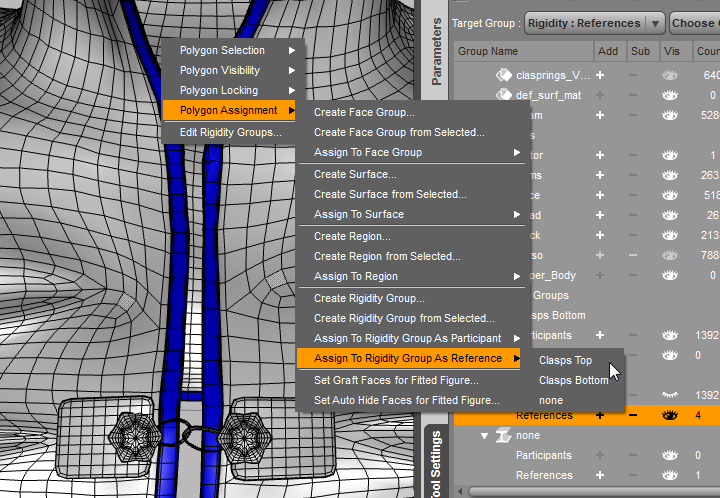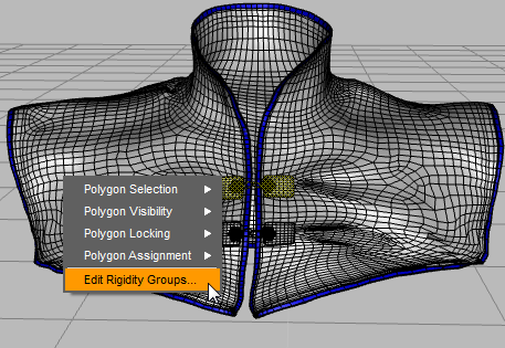 Adjust the properties of the Rigidity Groups as required, by opening the Rigidity Group Editor. This command is found in the Polygon Group Editor / Tool Settings Tab’s Advanced Options, or by right-clicking using the Polygon Group Editor tool.